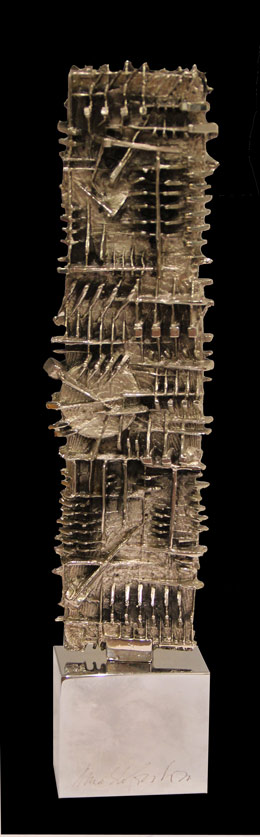 Arnaldo POMODORO Morciano di Romagna 1926 Stele, 1986 Bronzo argentato fuso a cera persa cm 22 X 4.5 X 3 Edizione di XX esemplari Edizione Albatros Firma, tiratura ‘Arnaldo Pomodoro’ (sulla base)
