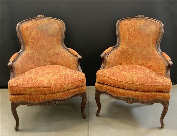 Coppia di poltrone di forma mossa con struttura in legno intagliato e imbottiture rivestite in tessuto operato a motivi floreali. Secolo XIX (difetti)