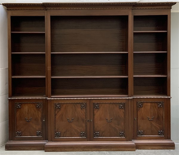 Mobile libreria in legno parte superiore a giorno e parte inferiore a quattro ante intagliate a volute (cm 200x180x40) (difetti)