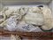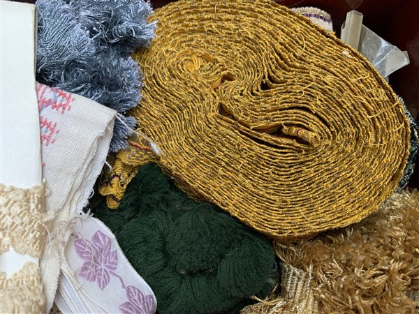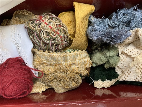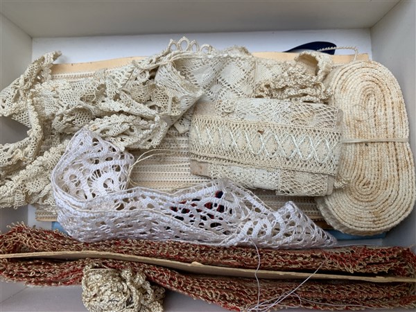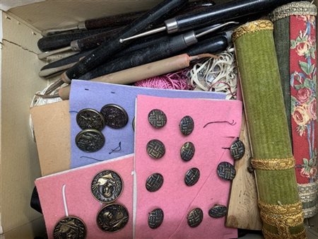 Cartone composto da numerosi pizzi antichi al tombolo e all'uncinetto comprendente tre cuffiette da notte, passamanerie, velette, cotoni da cucito, bottoni vecchi ed antichi in madreperla ed in metallo, attrezzature da tappeziere, aghi ed uncinetti