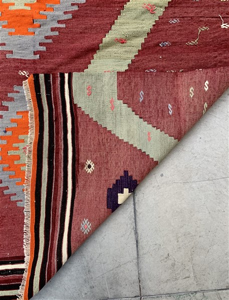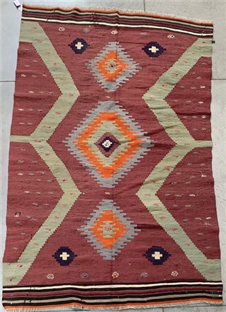 Tappeto Kilim, Anatolia, secolo XX. Disegno con medaglione con puntali formato da rombi concentrici (cm 228x138) (difetti)