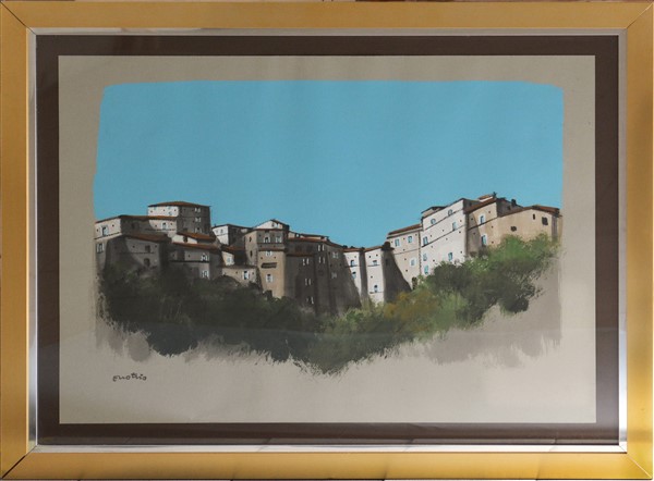 Enotrio Pugliese "Scorcio di paese" tecnica mista su cartoncino cm 49x69 firmat