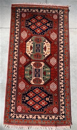 Tappeto Kars, Anatolia, secolo XX. Decoro con quattro medaglioni policromi su fondo marrone (Difetti e rotture)(cm 203x99)