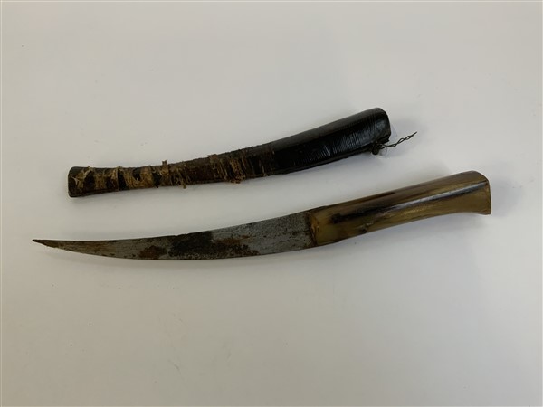 Coltello d'uso, manico in corno con lama ricurva ad un filo. Fodero in legno ri