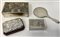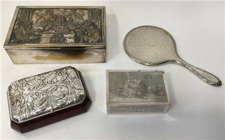 Lotto composto da due scatole in legno e argento, uno specchio a mano con punzoni inglesi ed una scatola in metallo argentato