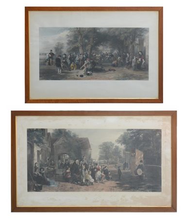 Due incisioni raffiguranti scene di villaggio, in cornice (cm 140x80; cm 115x82