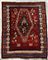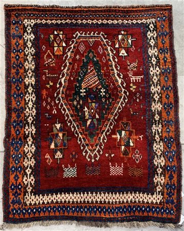 Tappeto Gabbeh, Sud Persia, inizio secolo XX. Decoro con medaglione romboidale uncinato su fondo rosso decorato con numerosi simboli stilizzati (cm 155x118) (difetti e rapature)