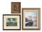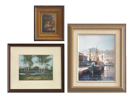 Lotto di tre dipinti raffiguranti paesaggio, scorcio di porto e fiori, autori e