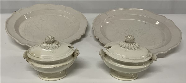 Due vassoi a bordo mistilineo e due salsiere in maiolica bianca (difetti)