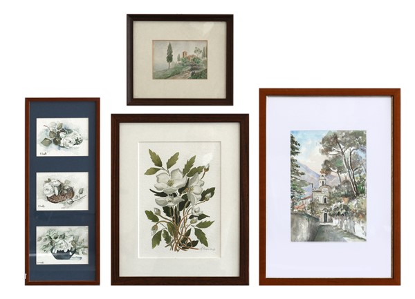Lotto di sei acquarelli raffiguranti "Paesaggi e fiori" autori e misure diverse, contenuti in quattro cornici