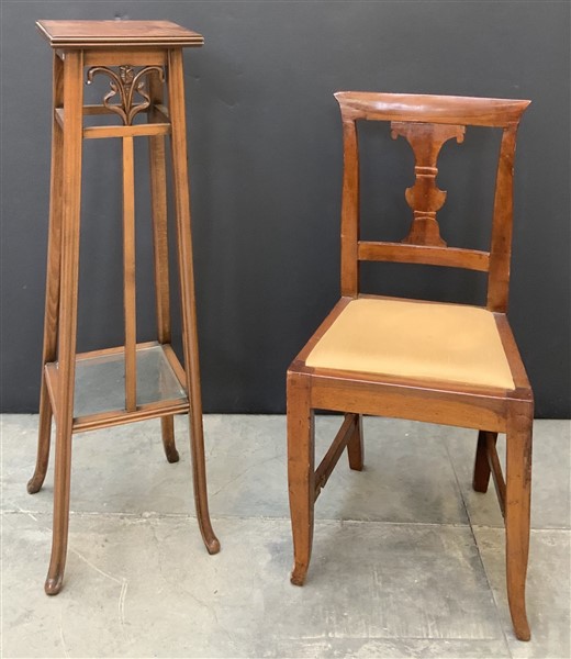 Lotto composto da una base portavaso intagliato a volute, gambe riunite da pianetto in vetro (cm 30x104x30) unita ad una sedia diversa (difetti)