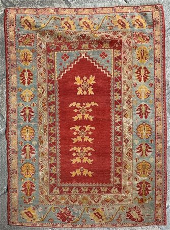 Tappeto preghiera Kirscheir, Anatolia, inizio secolo XX. Mirab a fondo rosso con mazzi di fiori stilizzati, bordura a palmette su fondo azzurro (Difetti e rapature) (cm 153x110)