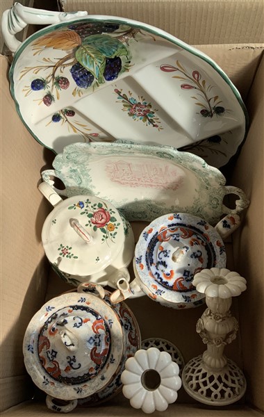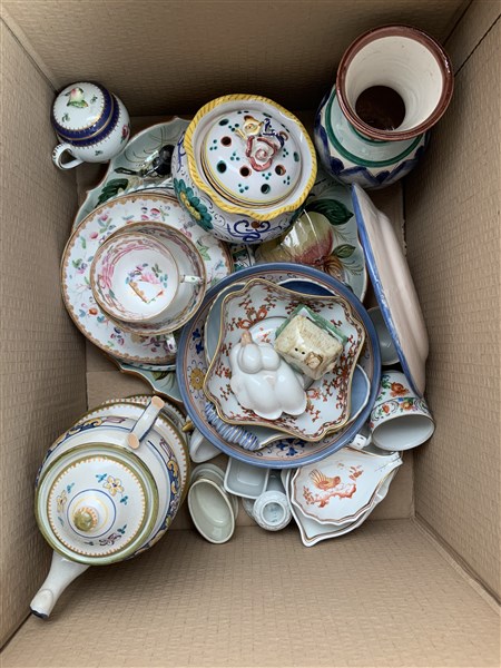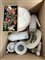 Lotto di tre cartoni contenenti numerosi oggetti per la tavola in ceramica di manifatture ed epoche differenti (difetti)