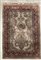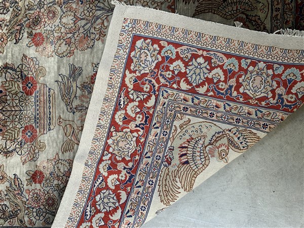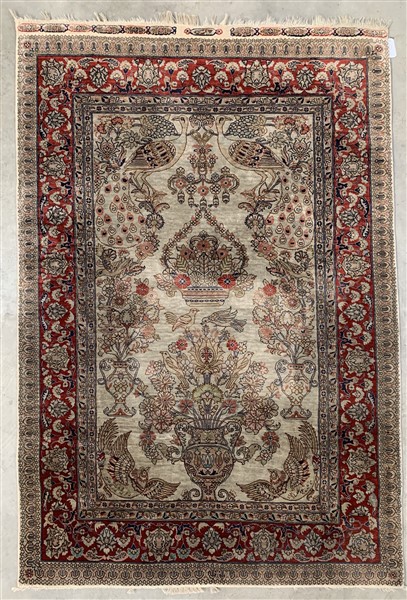 Tappeto preghiera Tabriz, Persia, secolo XX. Annodato in seta su orditi e trame in seta. Mirab decorato con vaso fiorito con volatili, lampada votiva e due pavoni agli angolari. Ad una testata cartigli floreali, un cartiglio al centro con iscrizione islamica su fondo con lavorazione Sumak (cm 112x76) (lievi difetti)