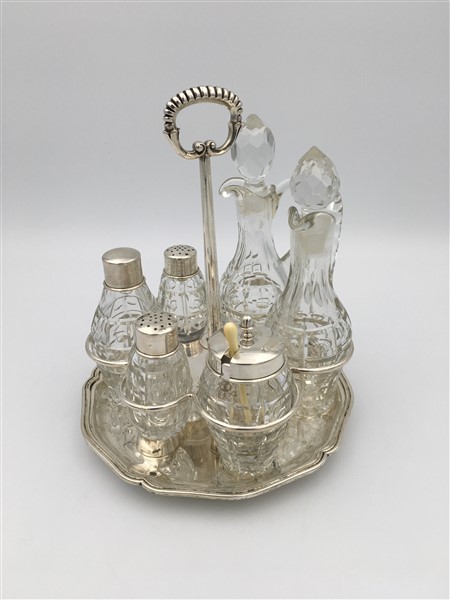 Base porta cruet in argento a bordura sagomata, presa ad anello, bottiglie non