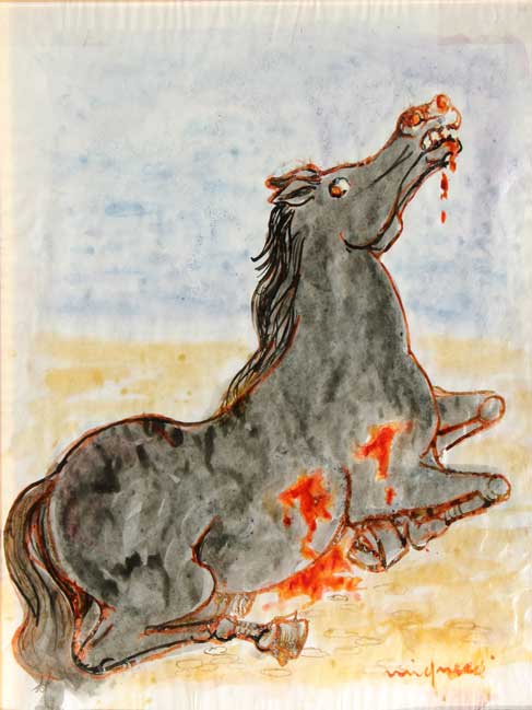 Giuseppe MIGNECO Messina 1908 - Milano 1997 Romanza della guardia spagnola, 1986 China colorata su carta cm 28 X 22 Autentica dell’artista su fotografia Bibliografia ‘Migneco, catalogo generale’ a cura di N. Luciani, Ed. Bonaparte, Milano, 1990, vol. II, p. 304, ill. 1093 Firma ‘Migneco’ (in basso a destra)