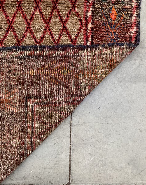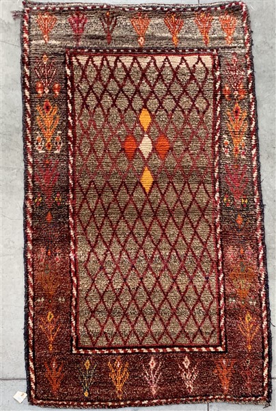 Tappeto Gabbeh, Sud Persia, inizio secolo XX. Decoro a griglia su fondo pepe e sale. Bordura con alberi della vita (cm 178x100) (difetti)