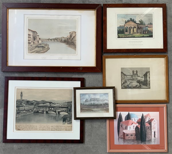 Cartone contenente dodici tra riproduzioni e incisioni di autori e misure differenti, in cornici, ed una specchiera con cornice in legno intagliato (difetti)