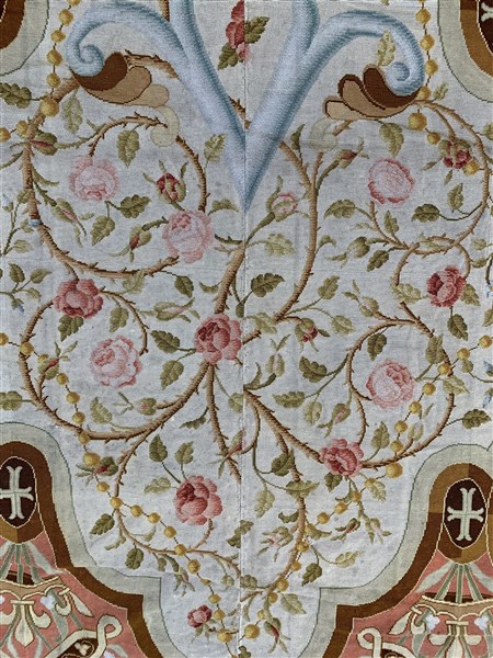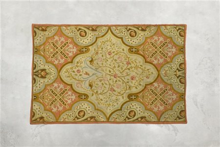 Tappeto piccolo punto, Francia, secolo XIX. Decoro con medaglione polilobato decorato con volute fiorite (cm 299x195) (difetti e piccoli strappi)