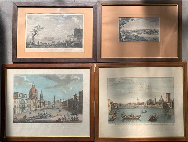 Lotto di tre antiche incisioni raffiguranti Praga, Napoli e Firenze, unite a due riproduzioni a colori raffiguranti l'Arno e Piazza Navona, in cornici (difetti)