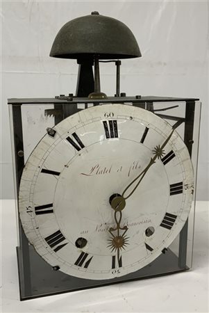 Movimento a due treni con suoneria delle ore e mezze su campanello e scappamento a verga rovesciata.