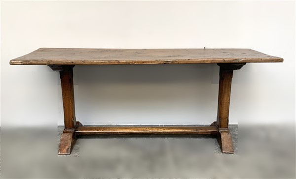 Antico tavolo con gambe a colonna quadrata, traversa dritta, piedi a ciabatta (