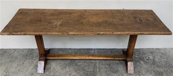 Antico tavolo con gambe a colonna quadrata, traversa dritta, piedi a ciabatta (cm 194x79x60) (difetti)