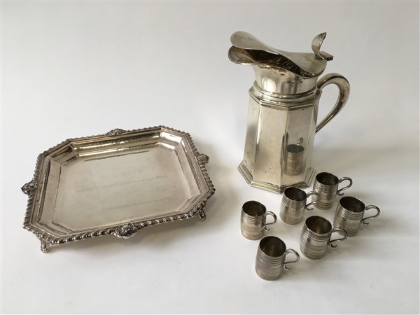 Lotto composto da un thermos, un centrotavola e sei bicchierini in argento (g lordi 1400) (lievi difetti)