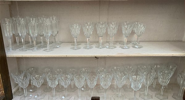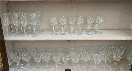 Baccarat, servizio da tavola in cristallo composto da dodici calici da acqua, dodici calici da vino, dodici per liquori e dodici flutes (difetti)