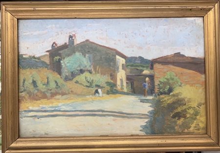 Firma indecifrata "Scorcio rurale" olio su compensato (cm 38x59) firmato in basso a sinistra, in cornice