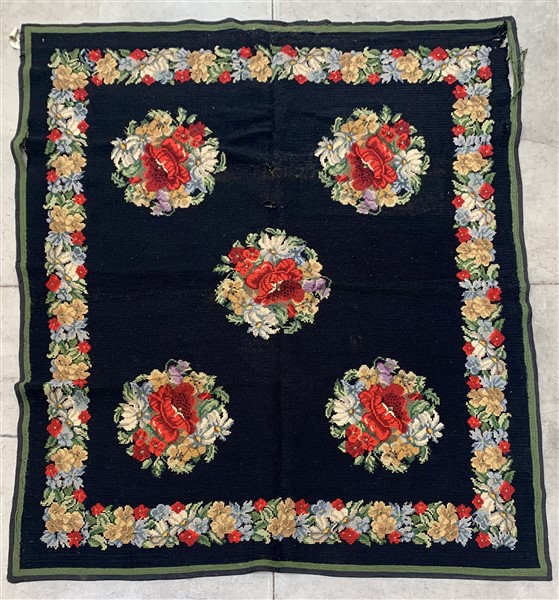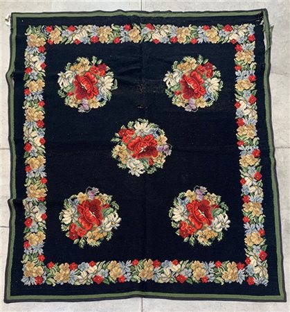 Tappeto piccolo punto, Francia, secolo XIX. Decoro con cinque bouquette di fiori policromi su fondo marrone scuro contenuti da una bordura formata da una ghirlanda di fiori (cm 187x163) (difetti e rotture)