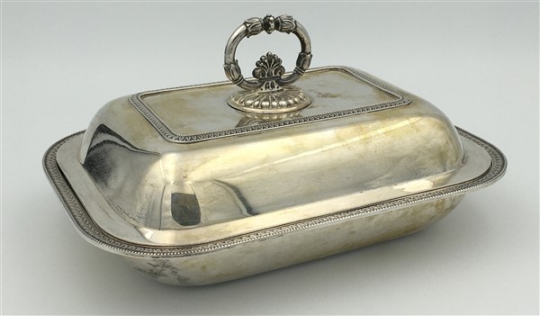 Legumiera in argento decorata a palmette lungo il bordo. Presa del coperchio ad anello, Titolo 800, Alessandria. Argentiere Ricci & C. Spa. (cm 28,5x14x21) (g 900)