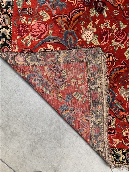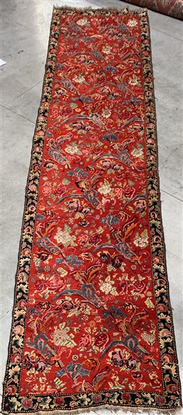 Tappeto passatoia Karabagh, Caucaso, fine secolo XIX. Decoro floreale di ispirazione francese su fondo rosso (cm 488x113) (difetti)