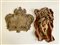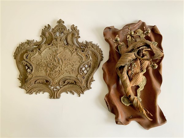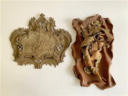 Lotto composto da un portalettere da parete in ghisa e un elemento decorativo in metallo, cuoio e legno (h max cm 55) (difetti)