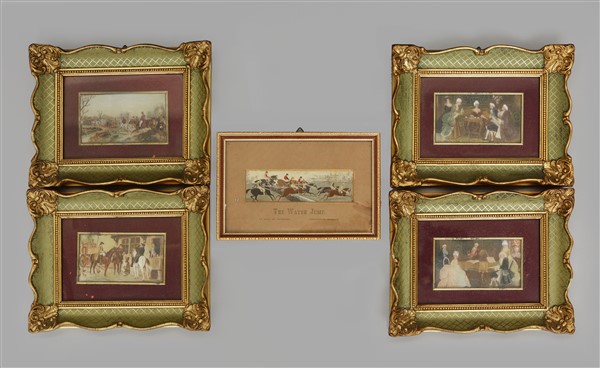 Lotto composto da quattro quadretti di soggetto diverso (cm 7x12) in cornici di legno laccato e dorato ed un ricamo di manifattura inglese (cm 5x15) raffigurante corsa di cavalli, in cornice (difetti)