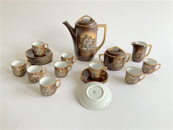 Manifattura cecosalovacca Epiag, servizio da caffè in porcellana policroma con scene agresti femminili su campo marrone, composto da nove tazzine e dieci piattini, caffettiera, lattiera e zuccheriera (lievi difetti)