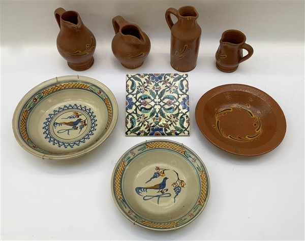 Lotto composto da quattro versatoi, tre piatti ed una piastrella di manifatture
