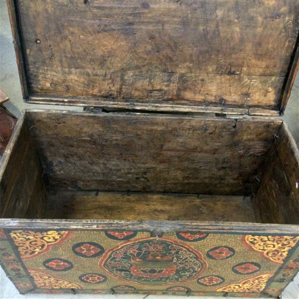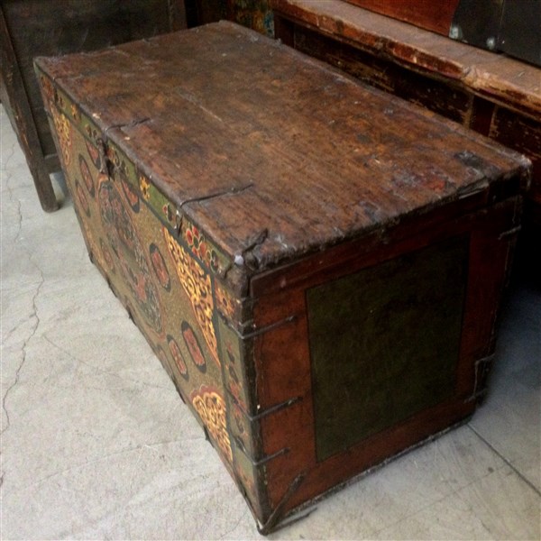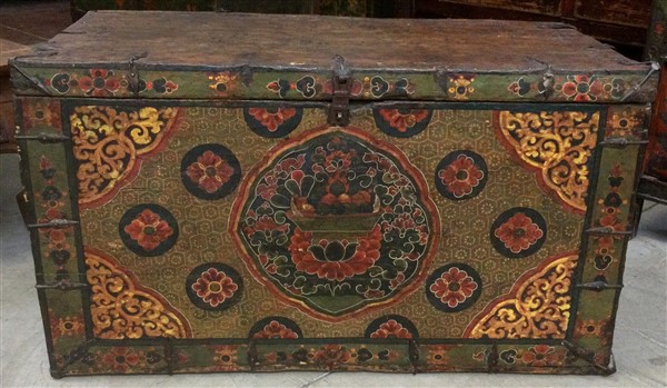 Antico baule tibetano decorato in policromia a motivi geometrici e parzialmente