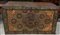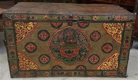 Antico baule tibetano decorato in policromia a motivi geometrici e parzialmente dorato (lievi difetti)