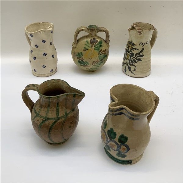 Lotto composto da quattro versatoi ed una fiasca in ceramica smaltata con decori a motivi floreali ed uno con stemma, manifatture ed epoche differenti (h max cm 22) (difetti e restauri)
