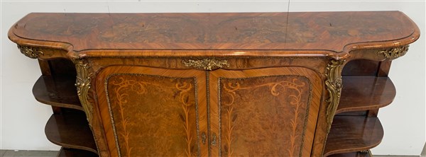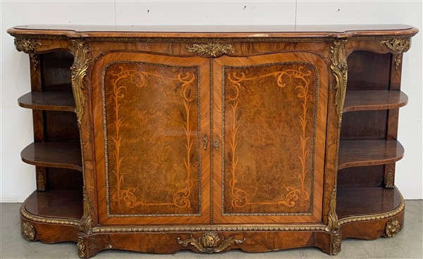 Credenza di forma mossa con due ante centrali e vani laterali, decorata con filettature e intarsi a volute e guarnizioni in bronzo. (cm 192x100x42) (difetti, restauri e mancanze)