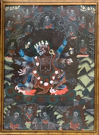 Tanka tibetano dipinto a tempera su carta raffigurante figure, demoni e divinità (cm 70x51) in cornice