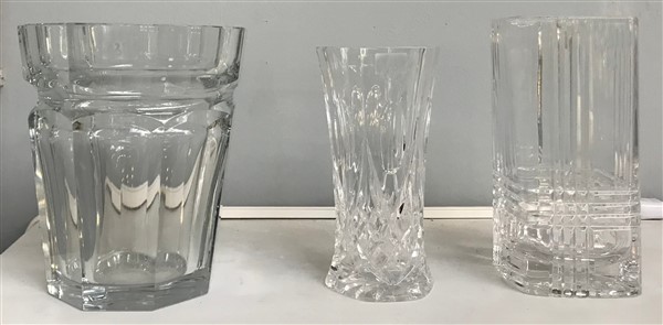 Lotto composto da tre vasi diversi in vetro e cristallo di cui uno marcato Baccarat (difetti)
