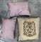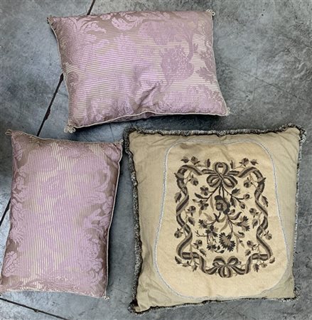 Lotto di tre cuscini confezionati con tessuti damasco in seta nei toni del lill