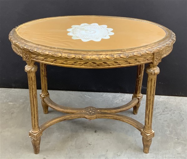 Tavolino ovale in legno intagliato e dorato, gambe tornite e scanalate riunite da traversa (cm 80x62x50) (difetti)