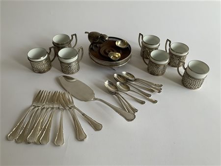 Lotto composto da sette tazzine in porcellana con cestelli in argento traforato, dieci cucchiaini, una paletta e undici forchettine in argento di fatture differenti, e una saliera a forma di pulcino e gusci d'uovo in argento su base in legno (g 1050 lordi) (lievi difetti)