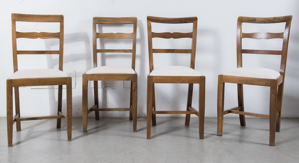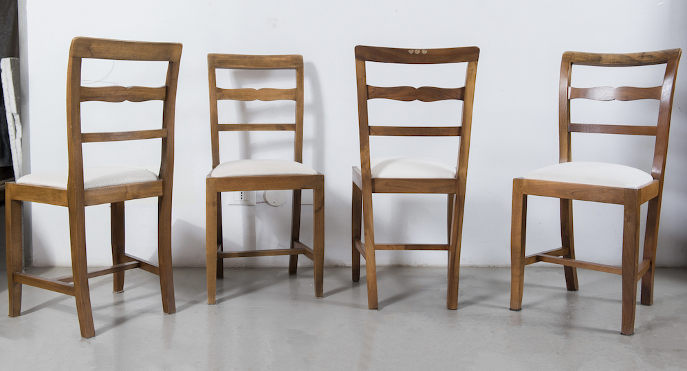 Lotto composto da otto seggiole in massello di noce. XX secolo. Cadauna di cm 91x42,5x45,5.