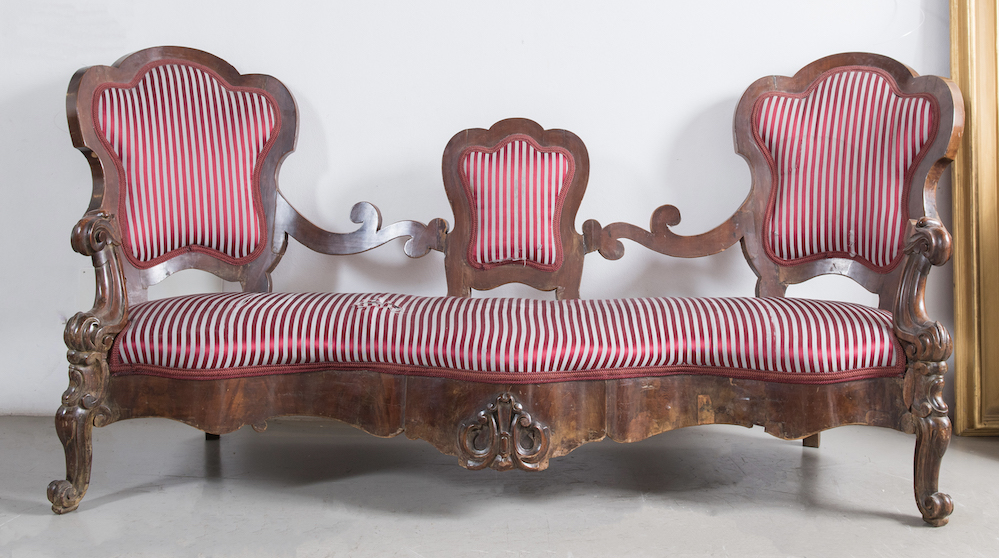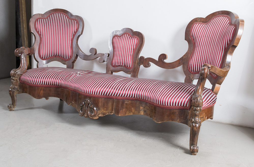 Grande divano, in stile Luigi Filippo. Metà del XIX secolo. Lastronato in noce. Cm 108x220x80. (difetti)