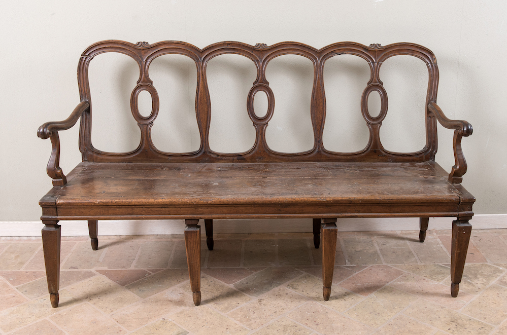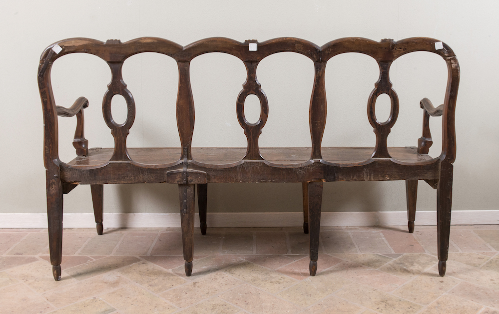 Canapè in legno di noce sagomato. Metà del XVIII secolo. Cm 91x151,5x61. (modifiche e difetti)
