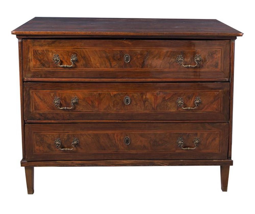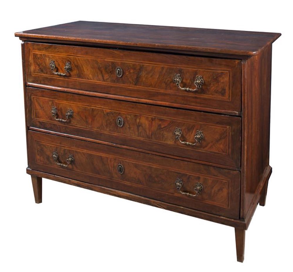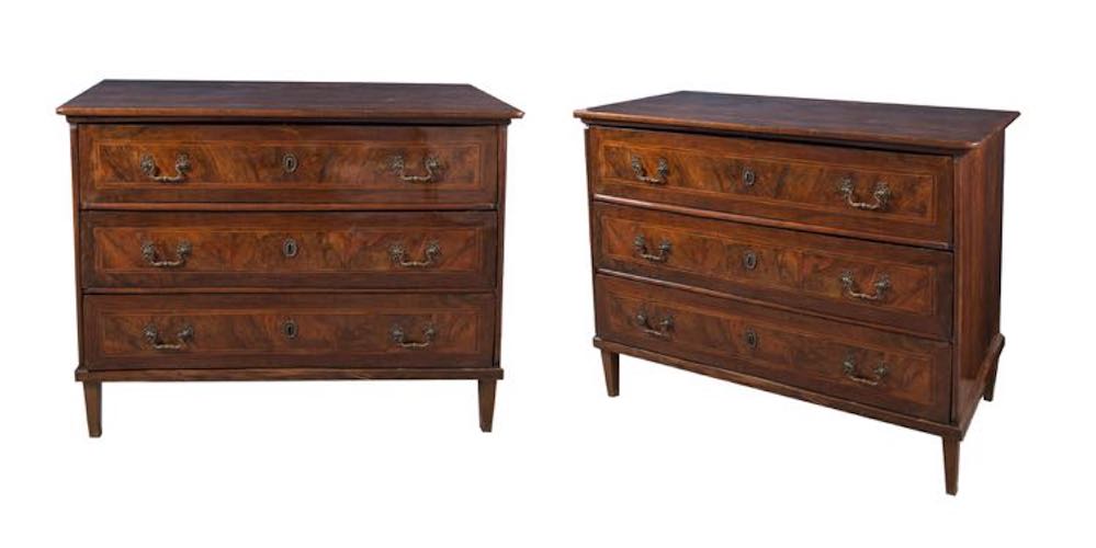 COPPIA DI CASSETTONI in stile Luigi XVI. Emilia (Modena o Bologna), seconda metà del XVIII secolo. Fronte lastronato in noce con 3 cassetti lastronati in radica e filettati in acero e ciliegio. Cm 95x128x59. (difetti)